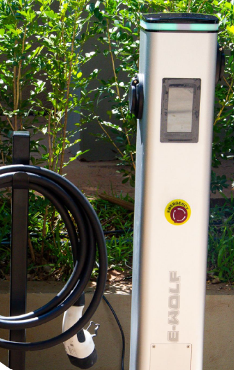 Potência: 7,2 kw / 32A -- Alimentação: 220 VAC (monofásico) 60Hz -- Nível de proteção: IP55 (armazenamento) IP54 (veículo acoplado) -- Instalação em pedestal ou parede -- Plug (rede elétrica): 2P+T-32A (padrão industrial, com cabo 1m) -- Botão de emergência -- Interface de comunicação: WIFI e OCPP 1.6